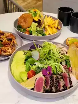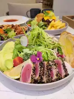 This super brand dish is really big ❗️ There are many healthy ingredients ❤️, the tuna fried with sesame seeds is the highlight! Super delicious! There are also chicken strips, spring eggs, purple sweet potato puree, kale, very fresh salad vegetables, and sourdough bread.
