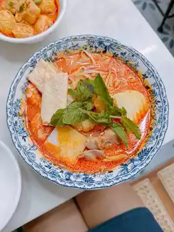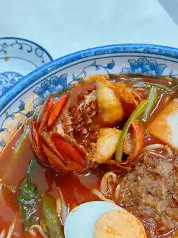 Curry Laksa 🥢 Laksa soup is rich with coconut flavor 🥥 Ingredients include potatoes, chicken pieces 🐔 spring rolls, fish fillets 🐠 sprouts, shrimp 🦐 fried bean curd skin, mint leaves 🌱 very filling 🤤
