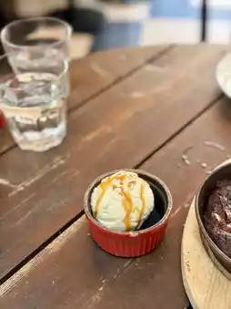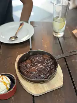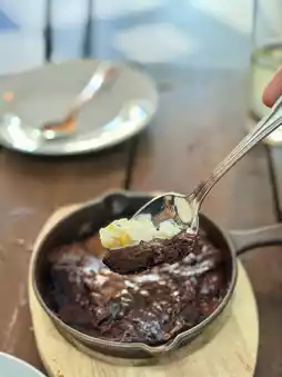 Brownie: Crispy on the outside and soft on the inside, the taste is extremely contrast: Because it is baked directly in the oven in a cast iron pot, the heating is very even and direct, so the edges and bottom will form an extra crispy "shell", while the inside remains almost lava cake-like moist, soft, even somewhat runny. This contrast in taste is the biggest highlight.