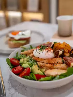 The waffles are filled with potatoes, giving them a rich, potato-flavored texture. They're delicious even on their own. Topped with avocado and sweet crab salad, they're enriched with mayonnaise. Add a large sunny-side-up egg and you're ready to go!