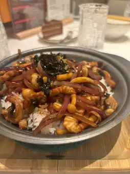 The eel is thickly cut and full of sauce. The white rice is baked in a casserole until slightly browned, which is excellent.
