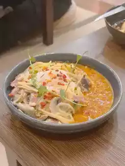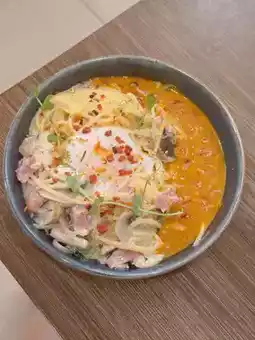 French Lobster Sauce Hot Spring Egg Carbonara Pasta 🍝 Set $204 💰 Pasta cooked until Al Dente 💯 plus melted egg 🥚 mushrooms 🍄 🟫 bacon and others 🥓 mixed together to taste Creamy 🤤 but slightly less lobster sauce presence 🦞😔