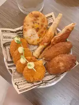 Fried food platter 🥢 single order $ 88 💰 with wild vegetable fish cake 🐟 shrimp cake 🦐 chicken skin dumplings 🥟 original chicken wings 🐓 Each one is fried crispy 😆 shrimp cake is very bouncy 😛 chicken wings Juicy 👍🏻