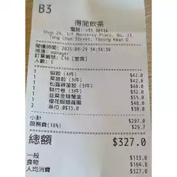 Total price for 2 people $327, tea table $15 per person, plus 10% service charge!