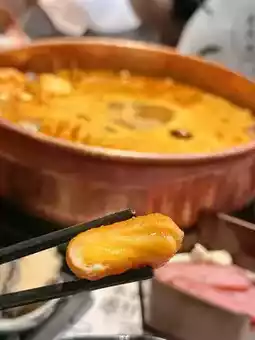 Featuring Japanese A4 Kuroge Wagyu beef, 🥩 each piece is generously cut and evenly marinated, with a vibrant red color. The beef is incredibly tender and fragrant within seconds. 🤤 Paired with the pepper pork belly and chicken hot pot, the flavors are rich and complex, with a lightly spicy, warming sensation. 🍲 The broth is perfect for both meat and side dishes, making it a sweet and nourishing broth.