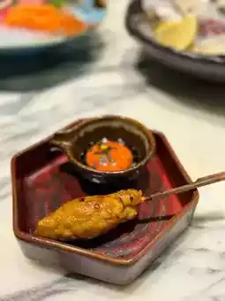 The chicken cartilage sticks are grilled to a lightly charred exterior and fragrant. The sauce is just the right amount of sweet and salty, and the crispy cartilage is a delicious treat. 🤤 Dipping them in a raw egg makes them even more slippery. 🍳
