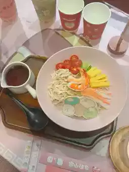 Special cold noodles π₯’ single order $ 85 π° with Sumikko Gurashi shaped fish board π₯ shrimp, crab sticks π¦ tamagoyaki π₯ cucumber π₯ cherry tomatoes π