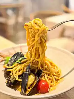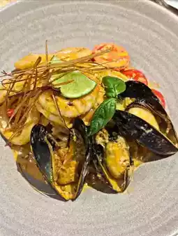 Coconut tom yum seafood spaghetti with mussels, prawns, and squid rings. There are quite a lot of ingredients, the tom yum sauce is more creamy, with a little lime juice, more freshness.