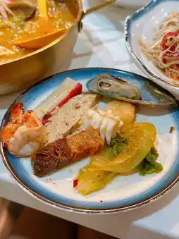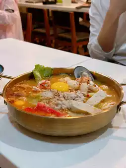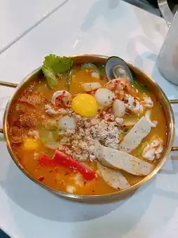 Seafood Tom Yum Army Stew (Small) 🍲 The Tom Yum soup is rich, sour, and spicy 🌶️ with an abundance of ingredients 😍 including shrimp 🦐, squid 🦑, scallops, mussels 🐚, minced meat, grilled pork belly 🐖, and pork rolls 🐷. Delicious and indulgent 🤤