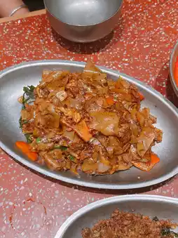 Thai dry stir-fried pork slices rice noodles🍜 fried dry and spicy🔥 plus carrots🥕 mustard 🥬egg🥚meat slices🥩 good😋