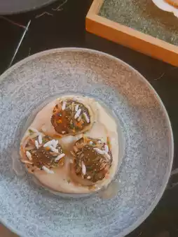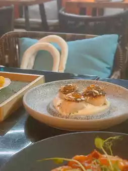- Pan-Seared Hokkaido Scallops with Squid Ink Garlic Aioli and Sakura Shrimp 🔥.