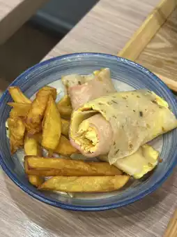 The egg pancake was pre-cut into halves for easy sharing. It was filled with melted cheese, ham, and scrambled eggs, offering a rich and satisfying taste. You can choose between sweet potato fries or macaroni in tomato sauce as a side; we went with the sweet potato fries, which were sweet and crispy.