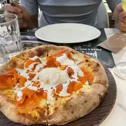The main pizza, with smoked salmon ๐, salmon roe ๐ , hot spring egg ๐ฅ, cheese string, creamy smooth, great for photography and delicious, after eating still want to encore!