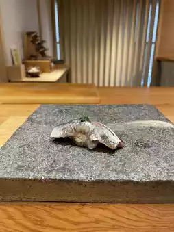 The sturgeon grilled with charcoal has a charcoal aroma and a firm texture.