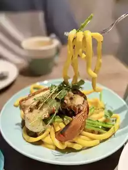 The lobster tail 🦞 has a slightly charred flavor and is well-seasoned, but the meat is a bit dry and sticks to the shell. The straw pasta has a springy texture. The lobster sauce is a bit light and doesn't cling well to the pasta; it would be better if it were thicker.