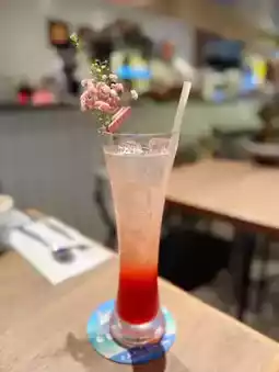 A mix of strawberry puree, orange juice, and lime soda, offering a sweet and tangy flavor that's refreshing and appetizing.