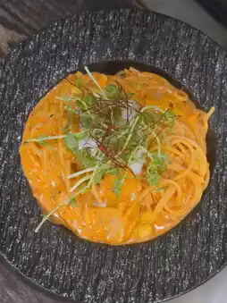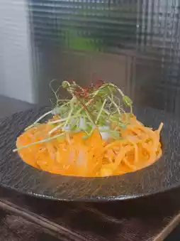 The pasta is creamy, and the kimchi is flavorful with a balanced level of acidity and spiciness. Adding the onsen egg makes it even better.