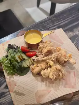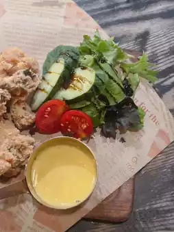 The drumsticks are fried to a crispy perfection, and the chicken is tender. It comes with a small Italian vinaigrette salad on the side.