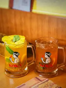 The fruit teas come with a slice of pineapple on top to help cut through the greasiness and are perfect with skewers.
