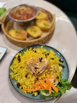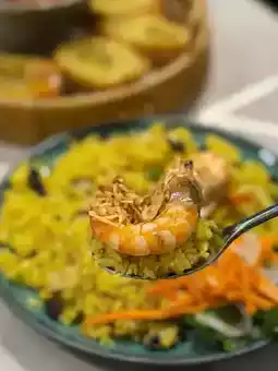 The pineapple fried rice looks quite eye-catching! The rice is golden and distinct, with two shrimps built into a heart shape is quite interesting π€£ The rice is fragrant, absorbing the sweet and sour pineapple, eating fresh and appetizing ~ It contains shrimp, mussels, squid, garlic, raisins, pineapple and onions.