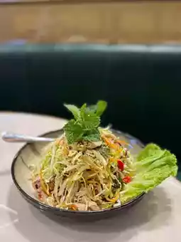 It's a refreshing and appetizing appetizer! The chicken strips are torn finely and seasoned, with fresh cucumber strips, carrot strips, mint leaves and fried onion and peanuts.
