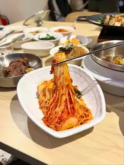 The table is filled with a variety of colorful side dishes, each one appealing.🫶🏻 The kimchi was a real hit with my friends and companions. It's incredibly crisp, not too salty or spicy, and delicious on its own or with rice. 👍🏻