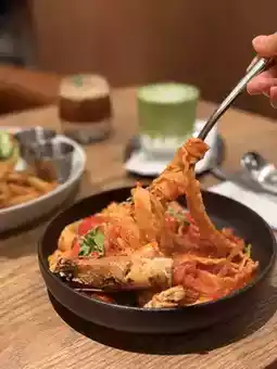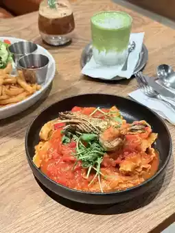 I walked by the restaurant and was drawn in by the aroma of coffee at the entrance. So I decided to go in and give it a try! The restaurant has a wide selection of food and drinks. This time I tried their pasta and two specialty drinks 🥤