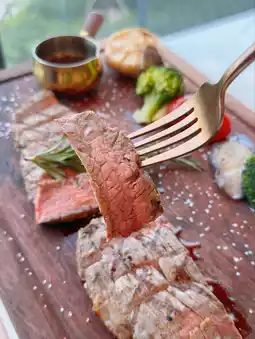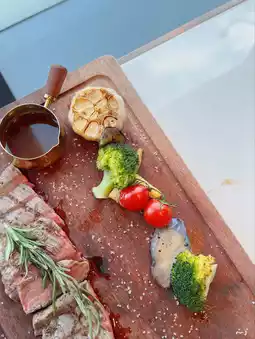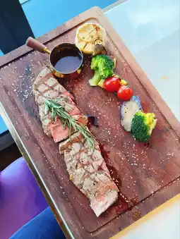 Grilled U.S. Grain-fed Flank Steak (12oz) with Seasonal Vegetables 🥩: The flank steak is grilled to a slightly charred exterior and tender pink interior 😍. It has a rich beef flavor, a chewy texture 😆, and is incredibly juicy 😋. Adding the sauce gives it a different taste 👍🏻. On the side, there are roasted garlic 🧄, broccoli, tomatoes 🍅, eggplant 🍆, and baby corn 🌽.