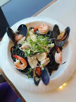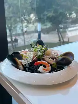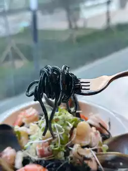Squid Ink Seafood Pasta 🍝: Includes shrimp 🦐, squid 🦑, and mussels 🐚. The squid ink sauce is mildly spicy with a hint of garlic 🌶️, making it delicious 🤤.
