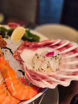 First, a seafood platter for two arrived! 🦐🦪 It was incredibly filling, including shrimp, abalone, oysters, sashimi, scallops, and squid, all incredibly fresh! 🥰