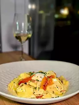 The first main course was carbonara fettuccine, topped with guanciale (Italian pork cheek), a runny egg, and Parmesan cheese, for a rich and mellow flavor.