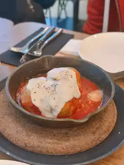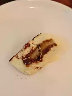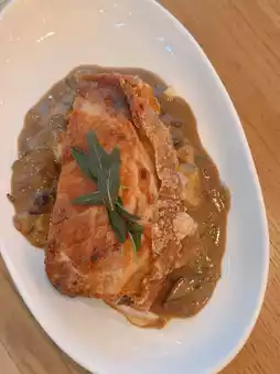 Italian Porchetta ๐: The Italian roasted pork belly is incredibly thick ๐ฑ, with a crispy skin ๐. However, the meat is slightly too salty and tough ๐ฅบ. It is served on a bed of mashed potatoes and black mushroom sauce ๐ฅ๐๐ซ.