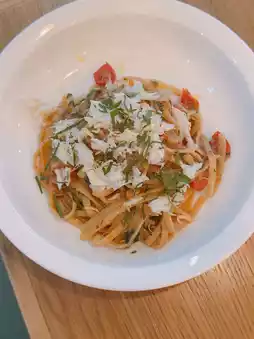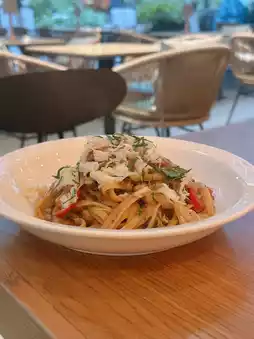 Crab Linguine ๐: The crab meat linguine ๐ฆ is coated with extra virgin olive oil ๐ซ, along with chili ๐ถ๏ธ, cherry tomatoes, and basil leaves ๐ฟ, offering a mildly spicy flavor ๐.