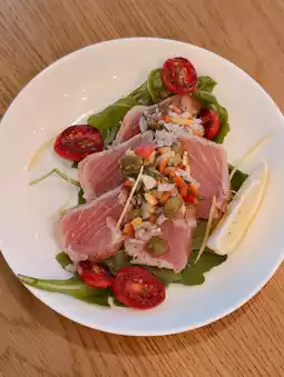 Seared Tuna ๐: The tuna is seared to medium-rare perfection ๐ฅ, accompanied by onions ๐ง