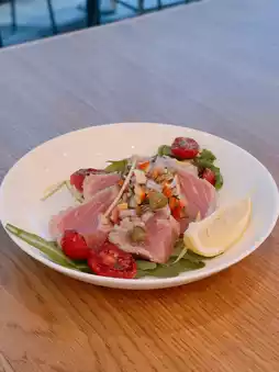 , capers, bell peppers ๐ซ, cherry tomatoes, and arugula ๐ฅฌ, with a drizzle of lemon juice ๐ for a refreshing and appetizing taste ๐คค.