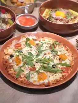 Pizza🍕 is a pizza base, crispy. There are plenty of ingredients, shrimp, salmon, squid, arugula, tomato, black olives, and a layer of cheese🧀, Yummy!