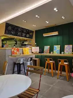 The restaurant's single-seat seating area is filled with artwork, creating an artistic atmosphere, making dining alone less lonely.