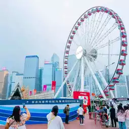 #KidsAttractions Take your kids on the Hong Kong Ferris Wheel for a 360-degree view. This landmark is a must-see for anyone visiting Hong Kong, offering panoramic views of Victoria Bay and the entire island of Kowloon. Adults pay 20 HKD, but if you want a private ride like we did, charter a private gondola for 160 HKD. This is a great value. It seats up to 8 people, and the gondola is cool and air-conditioned, rotating slowly three times. It's especially enjoyable in the evening, with blue skies and stunning sunsets. The surrounding area features musicians, restaurants, and ice cream shops, creating a wonderful atmosphere.