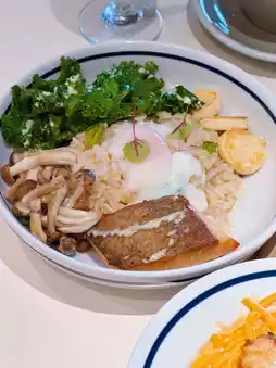 The salmon is fried very fragrant, the crust is crispy and the meat is firm🐟 Side dishes include kale/yuko tofu and mushroom rice. The seasoning is Meijen plum and a hot spring egg can be mixed with the rice to eat together. It is moist and does not affect the taste of the rice🥄