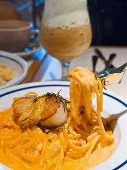 First came to eat a piece of seaweed is quite fresh and sweet 😆 The shrimp is not big but the doneness is just right tender ~ pasta soft and hard moderate sauce is also very Creamy in the middle also mixed with some crab meat to improve the freshness
