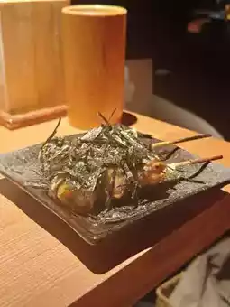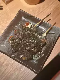 Seaweed Quail Eggs (2 skewers) 🥚 Quail eggs wrapped in pork 🥩, topped with salad dressing and seaweed 🖤, a perfect match 💯.