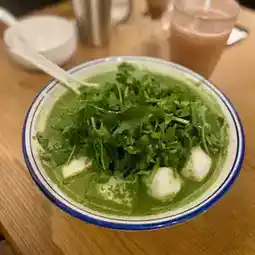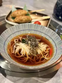 The udon noodles are smooth and thin, garnished with shredded seaweed, and served in a light and sweet broth.