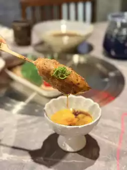 These chicken skewers, mixed with chicken cartilage, offer a rich texture. Dipping them in egg yolk adds a smooth and aromatic touch.