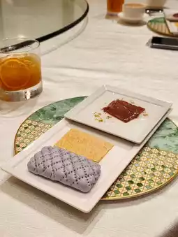 #Purple sweet potato ham with honey: This taro purple is gorgeous! The purple sweet potato gua bao (a type of steamed bun) features a unique diamond pattern, resembling a handbag. It's served with freshly baked crispy tofu skin, rich in bean flavor, Yunnan Xuanwei ham, and osmanthus honey. Enjoying it all together creates a delightful combination of soft, crispy, savory, and sweet flavors.