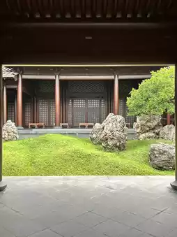 - White and wood colored ancient architectural promenade between the garden and Chi Lin Jingyuan: simple and elegant, extremely antique.