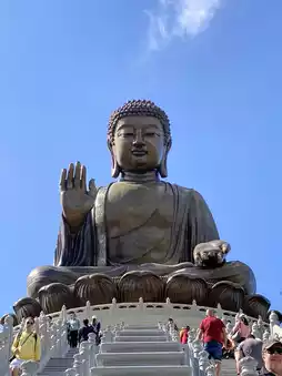 A bright and clear day at Tian Tan Buddha, Hong Kong’s most iconic spiritual landmark! 🙏✨ Despite the heat, the visibility is incredible — you can even spot Shenzhen from the Ngong Ping 360 cable car as it glides over lush green hills and drifting clouds. ☁️🚠