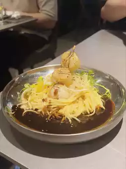 Flame Hokkaido Scallops with Seafood Fried Sauce Pasta + $66 Upgrade Set ๐ There are 3 grilled scallops on the surface ๐ฅ Seafood has mussels ๐ Octopus ๐ Plus fish cake ๐ with slightly salty fried sauce pasta, Creamy and delicious ๐คค