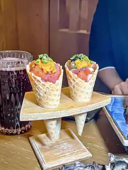 The meal starts with a Japanese-style salad and a five-color sashimi sea urchin cone, filled with sea urchin, tuna, yellowtail, salmon, and minced tuna in a crispy cone. The sashimi is so smooth and fresh, it feels like eating savory ice cream. Next, you can choose one of three appetizers: a mixed sashimi platter with fresh salmon, yellowtail, tuna, sea bream, and abalone; four creamy and sweet fresh oysters from Hyogo Prefecture, Japan; or a selection of six skewers, including chicken cartilage, caramelized pineapple, chicken wings, tender A4 Wagyu beef, shiitake mushrooms, and thick-cut beef tongue, all freshly grilled by the chef.