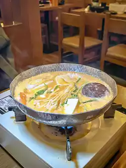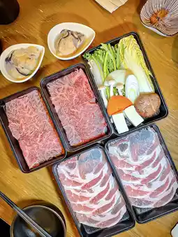 Next up are 12 types of unlimited sushi. My favorites were the seared A4 Wagyu beef, seared flounder fin, and premium fatty tuna sushi. The rice is marinated with red vinegar, adding a tangy flavor that enhances the taste. Additionally, the lunch menu includes limited hot pot options, with each person allowed two plates of Miyazaki A4 Wagyu beef, Hokkaido pork, and Hiroshima oysters. I chose the sea urchin lobster soup base, made by slow-cooking lobster and adding fresh sea urchin and soy milk for a rich and flavorful broth. For dinner, hot pot ingredients are unlimited.