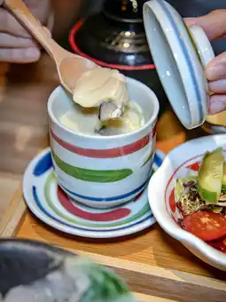 The lunch sets also come with a garden salad 🥗, kombu miso soup, and chawanmushi. The chawanmushi is packed with chicken, shiitake mushrooms, and ginkgo nuts, making for a satisfying meal. If you’re still hungry, you can order additional snacks, skewers, sashimi, or sushi from the All Day Menu. 🍣